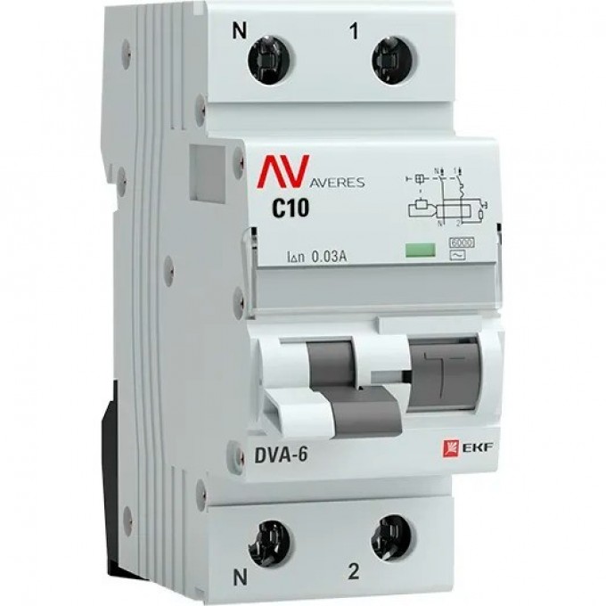 Выключатель автоматический дифференциального тока EKF 2п (1P+N) C 10А 30мА тип AC 6кА DVA-6 Averes EKF rcbo6-1pn-10C-30-ac-av